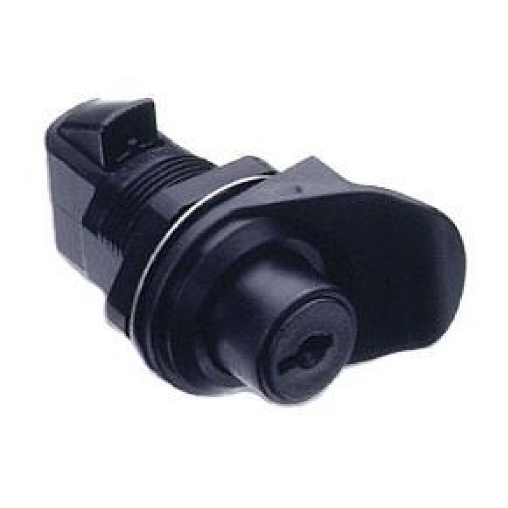 Southco kilit. UV ışınlarına dayanıklı siyah ABS gövdeli, paslanmaz çelik yaylı. Genellikle torpido gözleri ve VHF kutularında kullanılır.