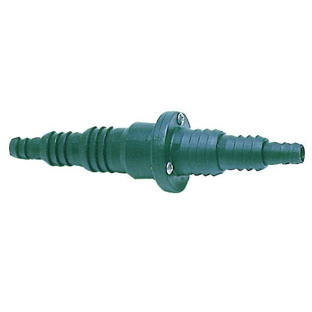 Hortum adaptörü, plastik. İçindeki çek-valf ile yalnızca tek yöne akışa imkan verir.
